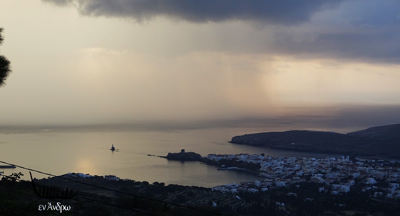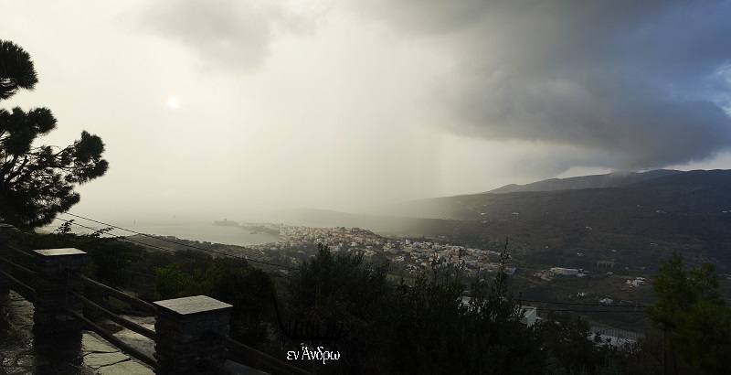 Παρασκευή 26 Αυγούστου 2022, ώρα 7:10 το πρωί. Από το μπαλκόνι μου στο Άνω Υψηλού βλέπω την καταιγίδα να έρχεται από την μεριά της θάλασσας. Απέχει λίγο από την Χώρα. Διακρίνεται όμως εμφανώς η "κουρτίνα" της βροχής. Είχε προαναγγελθεί καταιγίδα. Και την ώρα του πρωινού καφέ άρχισα να την φωτογραφίζω και να την βιντεοσκοπώ. Για κάτι τέτοιες μοναδικές στιγμές αξίζει κανείς να ζει στην Άνδρο. Ο ερχομός ενός καιρικού φαινομένου έτσι όπως αποτυπώνεται στην φωτογραφία εντυπωσιάζει...