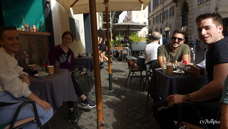 Πιο πολύ ενθουσιάστηκε ο Alessandro. Γνήσιος Ιταλός. Σηκώθηκε και πήγε κάθισε στο μέσο της νεανικής παρέας λέγοντας: "βγάλε μας όλους μαζί μια φωτογραφία..." Τους έβγαλα. Μετά ανταλλάξαμε γνωριμία. και με τα άλλα τρία παιδιά. Το αγόρι ήταν από την Κατάκοιλο και οι κοπέλες από την Χώρα. Μιλήσαμε για τις διαδρομές τους κοντά μια εβδομάδα στην Ιταλία. Μάθαμε τα νέα για τον πατέρα του Πέτρου και τα μελίσσια του στην Άνδρο. Μετά αποχαιρετιστήκαμε για να συνεχίσουμε την βόλτα μας στη Ρώμη.