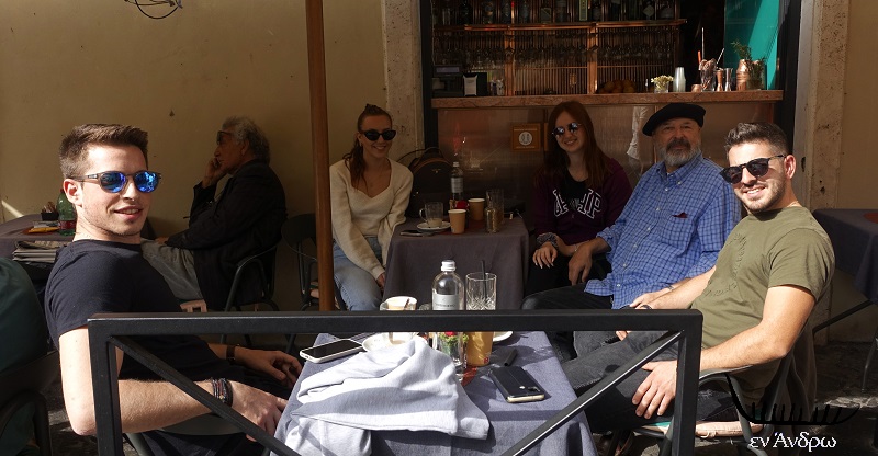 Γυρνώ έκπληκτος να δω ποιος με ξέρει στο μέσο της Ρώμης. Και βλέπω το νεαρό Πέτρο Βιδάλη με μια παρέα άλλων τριών νέων παιδιών από Άνδρο. Τον Πέτρο τον ξέρω καλά. Όταν ήταν μικρός έκανε ιστιοπλοΐα με την κόρη μου, την Μυρτώ, στο Ναυτικό Όμιλο Άνδρου. Πάντα ευγενικός, πάντα φιλικός, πάντα αξιοπρεπής. Την τελευταία φορά με χαιρέτησε στο Νειμποριό, στο αναψυκτήριο του Στυλιανού, πριν ενάμιση μήνα. Και ξάφνου τον βρίσκω να με χαιρετά χαμογελαστός στο κέντρο της Ρώμης σε ένα καφέ στο Campro De Fiori. Πόσο μικρός είναι ο κόσμος; Πόσο πολύ ταξιδεύουν οι ανδριώτες; Πόσο παράξενη είναι η ζωή; Τι πιθανότητες υπήρχαν να γίνει αυτή η συνάντηση που μας ενθουσίασε όλους.
