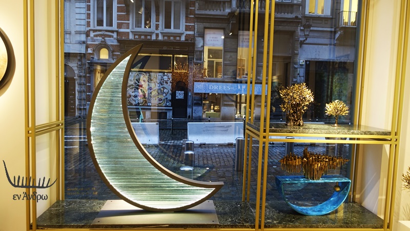 Στην προθήκη ένα υπέροχο μισοφέγγαρο του Κώστα Βαρότσου. Με τον Κώστα είχαμε βρεθεί στο Μεσογειακή Συνάντηση Νέων Καλλιτεχνών στην Βαρκελώνη το 1985. Ένα βράδυ το 1988 καθίσαμε παρέα στην Ομόνοια σε μια σκαλωσιά. Έφτιαχνε τον Δρομέα του. Ήταν παραγγελία του τότε δημάρχου Αθηναίων Μιλτιάδη Έβερτ. Ο Δρομέας αργότερα μετακινήθηκε στο Χίλτον. Κι εμείς μετακινηθήκαμε στο εξωτερικό. Ο Βαρώτσος είχε μετακινηθεί - επί δημαρχίας Δ. Γιαννίση - κι έκανε μαθήματα ζωγραφικής στην Άνδρο! Και να που ξάφνου ξανασμίγουμε με το έργο του στις Βρυξέλες. Με αναφορές και οι δύο από την Άνδρο. Παράξενο, η Άνδρος ενώνει ακόμα και με αυτούς που έχεις χαθεί...