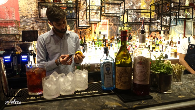 Ο τρόπος που έκοβε το πορτοκάλι για το κοκταίηλ - ώστε να πάρει γεύση - ήταν χειρουργικός! Πάνω στον πάγκο του μπαρ τα τρία μπουκάλια με τα ποτά, ο πάγος στα παγωμένα ποτήρια και η κανάτα με το κοκτέηλ που το πασπάλιζε με το πορτοκάλι πριν σερβιριστεί: η τέχνη του κοκταίηλ σε όλο της το μεγαλείο...