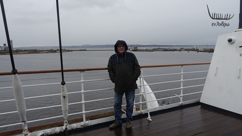 Από τις δεκάδες φωτογραφίες της Britannia - που βγάλαμε - επιλέξαμε μόνο μια. Αυτή στη βαρδιόλα του πλοίου με το χιονόνερο να πέφτει. Κι εμείς συγκινημένοι να γράφουμε ένα ακόμα στάσιμο σε ένα ακόμα βόρειο σημείο του χάρτη της ζωής. Στη Βόρεια Θάλασσα...