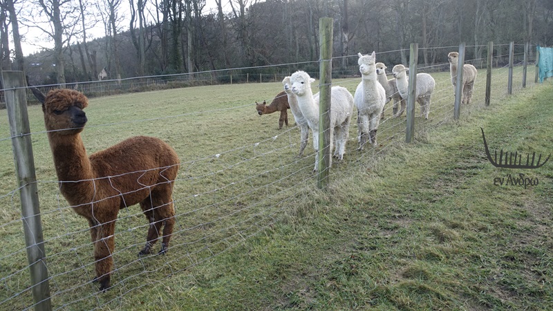 Το αλπακά είναι ένα είδος θηλαστικού καμηλοειδούς προβάτου της Νότιας Αμερικής. Είναι παρόμοιο με, και συχνά συγχέεται με, το λάμα. Ωστόσο, τα αλπακά είναι συχνά αισθητά μικρότερα από τα λάμα. Ήταν κάτι σπάνιο για εμάς μιας και ποτέ δεν είχαμε ξαναδεί τέτοιο ζώο. Φτάσαμε στην πόρτα του αγροκτήματος. Την βρήκαμε ανοικτή. Ένας σκωτσέζος αγρότης μας υποδέχτηκε χαμογελαστός. Του εξηγήσαμε τον σκοπό της επίσκεψης και εκφράσαμε την έκπληξη μας για τα περίεργα αυτά ζώα. Ανέλαβε με χαμόγελο και λίαν φιλόξενη διάθεση να μάς ξεναγήσει.
