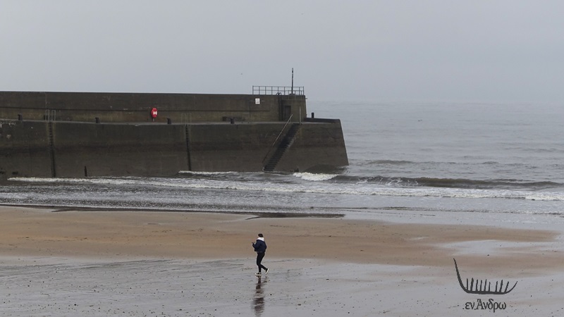 Ο λιμενοβραχίονας ορθωνόταν ψηλός στον άδειο από τα νερά πυθμένα. Ένας περιπατητής βάλθηκε να τρέχει διασκεδάζοντας. Το ελάχιστο νερό που απέμεινε δείχνει την υψομετρική διαφορά της παλίρροιας: από την άμπωτη μέχρι την πλημμυρίδα. Πάντα με εντυπωσίαζαν οι μεγάλες παλίρροιες της Βόρειας Θάλασσας.